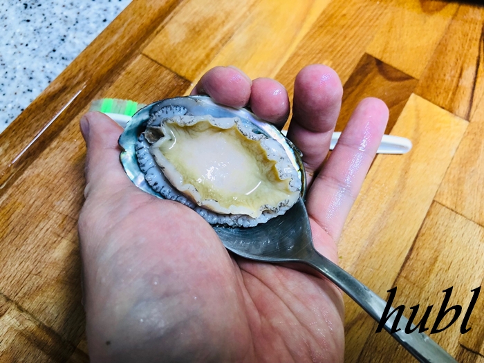 때를 벗긴 전복을 숟가락으로 전복을 껍질과 분리해