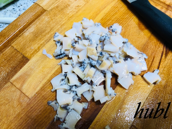 손질된 전복은 반을 잘라서 슬라이스 해서