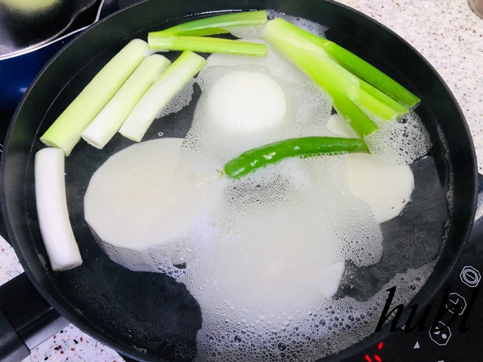 육수를 끓여주시는데 무, 대파, 청양고추